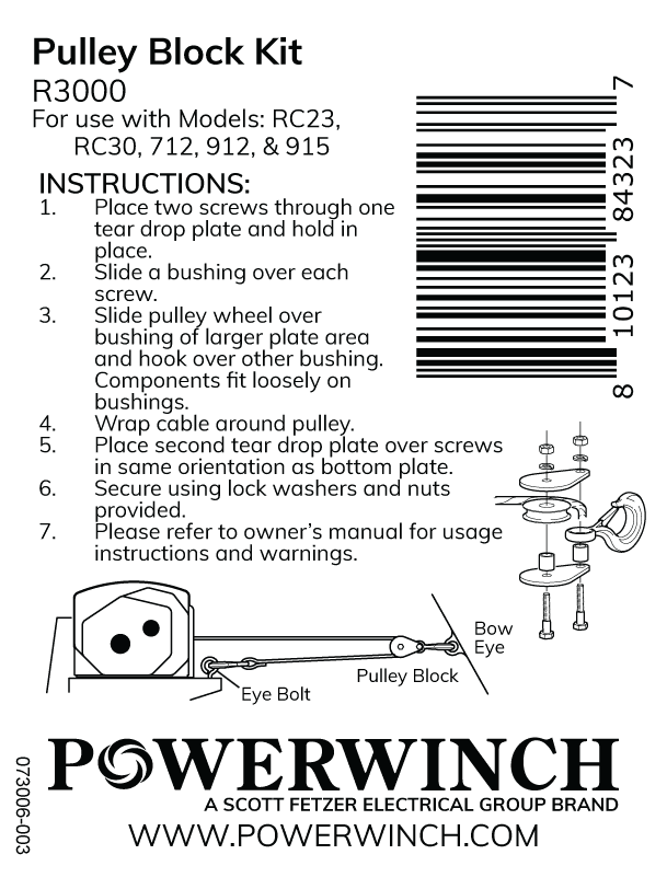 This selection comes with the deconstructed parts of the pulley block: a spacer, 2 pulley sides, a block wheel, 4 lock nuts, a sling eye hook, and 4 difference sized screws. The Pulley Block Kit is used in the RC23, RC30, 712, 912, and 915 trailer winches. It can be found in the replacement parts list of the Trailer Winch manuals linked here.